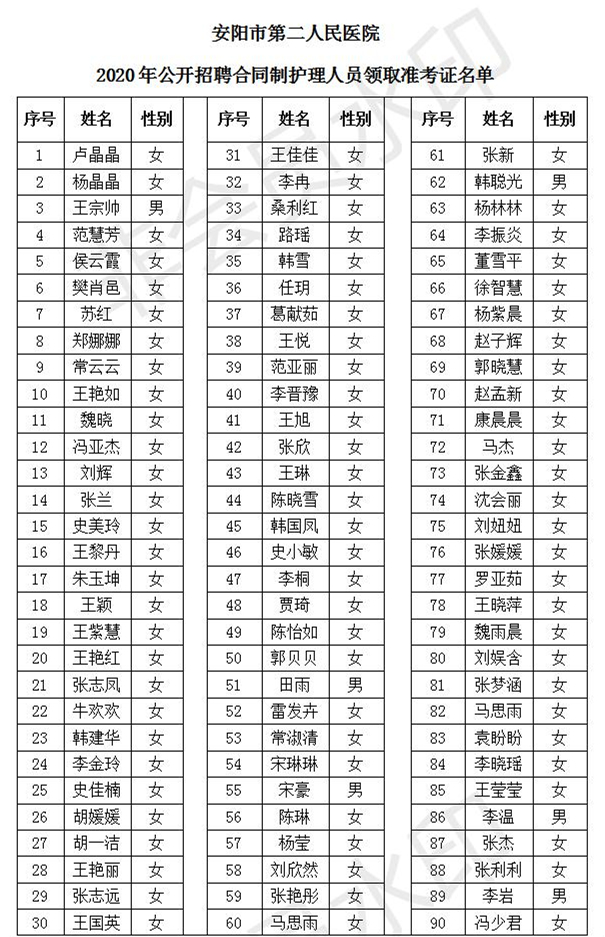 經(jīng)報名、資格審查,確定以下人員進(jìn)入考試程序,請本人持有效身份證于2020年7月20日至21日工作時(shí)間到市第二人民醫院人事科領(lǐng)取準考證。逾期不領(lǐng)者,視為自動(dòng)放棄考試資格。