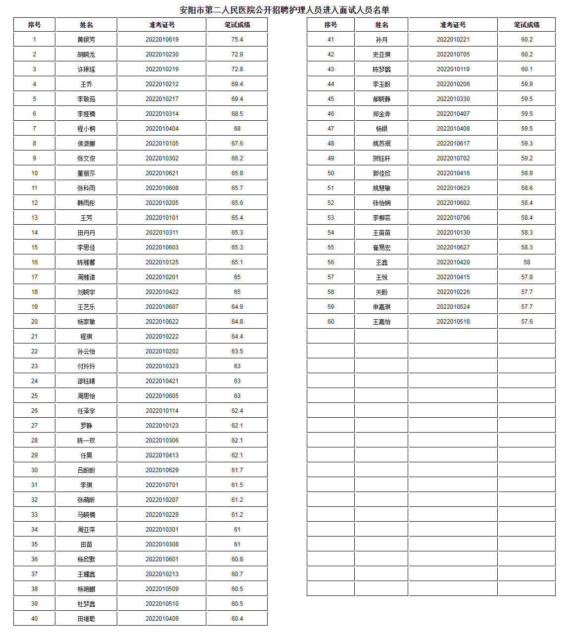 根據《安陽(yáng)市第二人民醫院2022年公開(kāi)招聘護理人員公告》有關(guān)規定,確定應聘同一崗位人員的筆試成績(jì)由高分至低分按1:3的比例進(jìn)入面試,末位應聘人員出現筆試成績(jì)并列時(shí),同時(shí)確定為進(jìn)入面試人選?,F將進(jìn)入面試人員名單予以公布,請進(jìn)入面試人員2022年5月27日到安陽(yáng)市第二人民醫院6號樓體檢中心領(lǐng)取《面試通知書(shū)》。