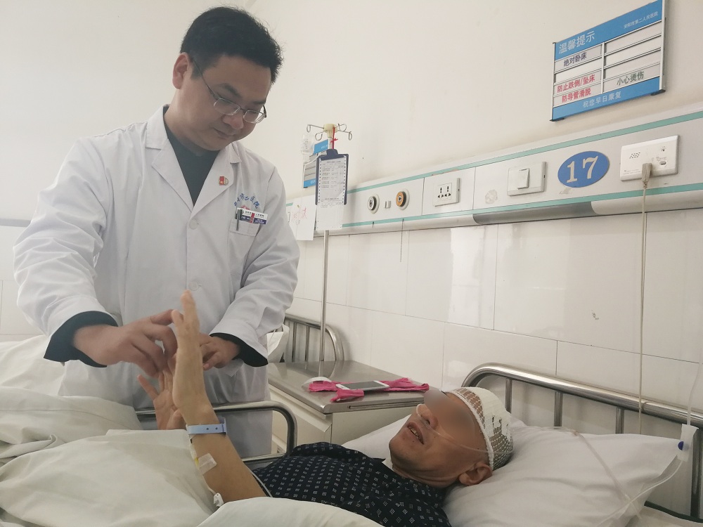 在同事們的印象中,危保松總是思維敏捷、行動(dòng)果斷、拼盡全力挽救病人的生命。3年前的一個(gè)夜晚,一位裝修工人在裝修過(guò)程中砸到頭部,家人送他來(lái)醫院時(shí)還能清楚描述自己的癥狀,可多年的行醫經(jīng)驗告訴危保松,這個(gè)患者的病情不容樂(lè )觀(guān)。果不其然,入院后不久患者就出現躁動(dòng)、失語(yǔ)等癥狀,緊接著(zhù)患者意識逐漸喪失。急診頭顱CT提示其顱內出血較多,且顱內雙側出血。對于這種危重病人的兇險病癥,一旦貽誤了時(shí)機,后果不堪設想。危保松敢冒風(fēng)險,勇?lián)熑?,果斷作出手術(shù)決定。向家屬告知病情后,家屬表示同意手術(shù),他帶著(zhù)值班醫生用盡可能短的時(shí)間完善術(shù)前準備,盡快進(jìn)行開(kāi)顱手術(shù)搶救患者。整個(gè)搶救過(guò)程就是爭分奪秒的跟死神賽跑,整整六個(gè)小時(shí)過(guò)去。最終,在凌晨時(shí)分,死神退縮了,病人得救了。