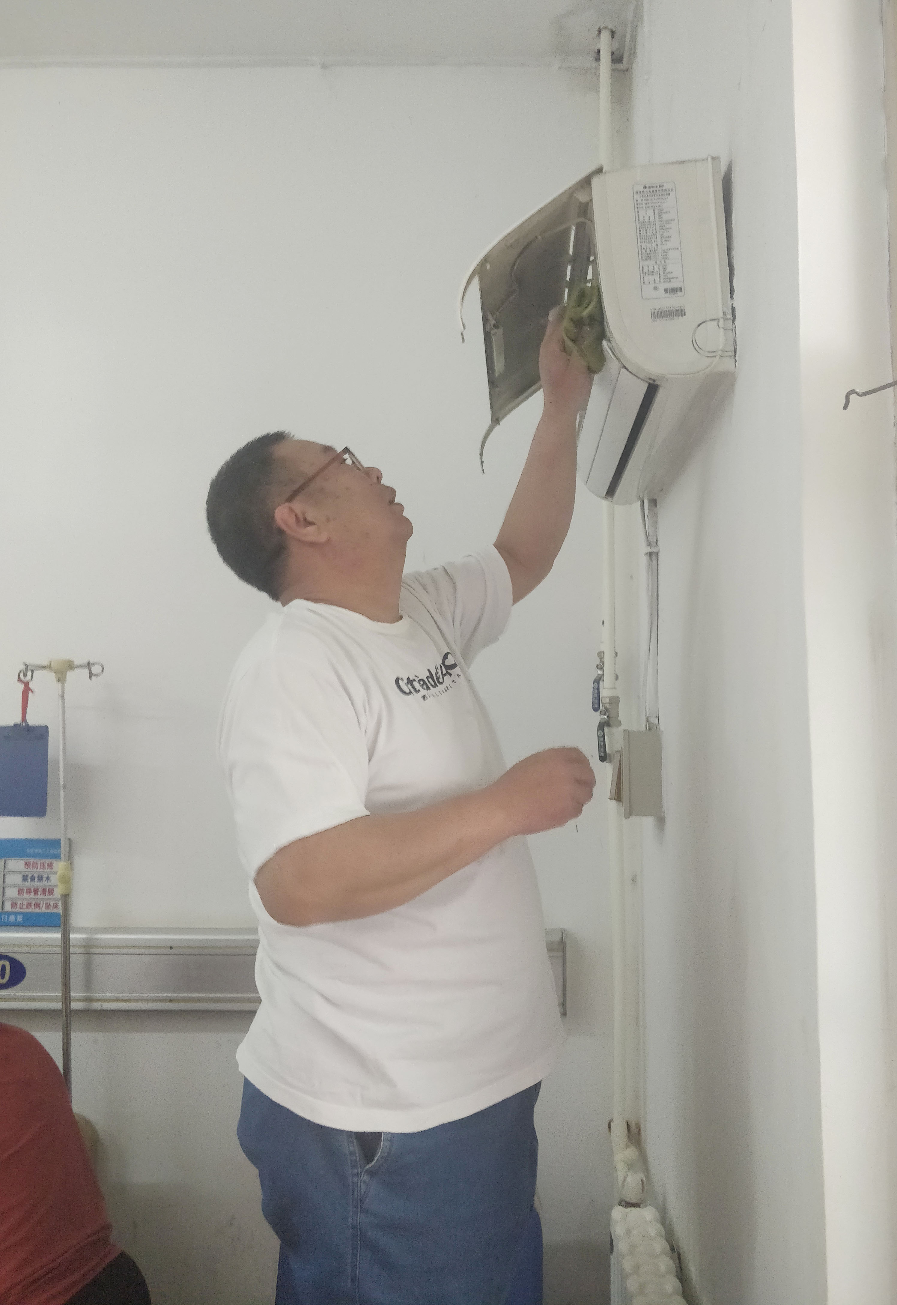 夏日臨近,總務(wù)科科長(cháng)林曉春、副科長(cháng)張永剛帶領(lǐng)科室人員進(jìn)行例行的空調使用前清洗工作。在病房,一位戴著(zhù)老花鏡站在凳子上認真清洗空調的工作人員引起了大家的注意,“張師傅不是要退休了嗎?怎么還在干活???”大家口中的張師傅叫張建國,是我們醫院總務(wù)科的員工,再有幾天他就要離開(kāi)他堅守了37年的工作崗位,退休回家頤養天年了。