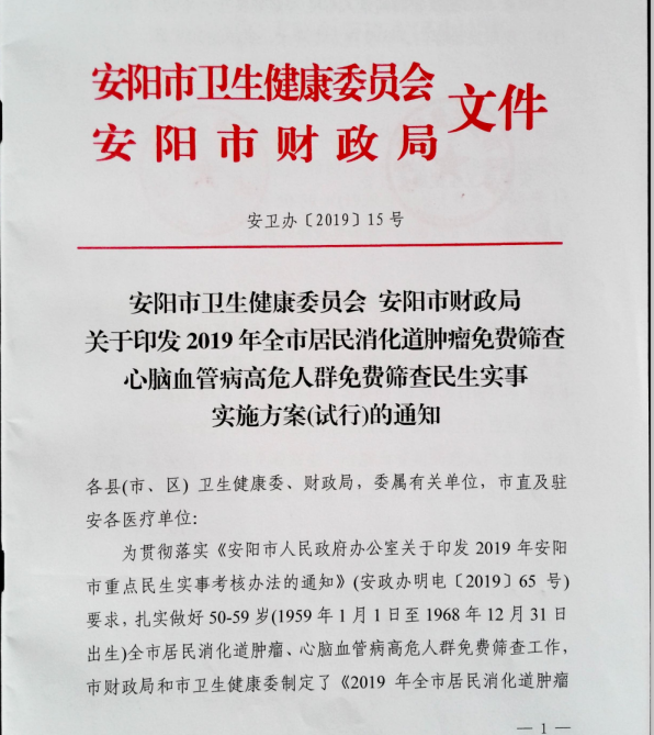為貫徹落實(shí)《“健康安陽(yáng)2030”行動(dòng)綱要》和《健康安陽(yáng)建設行動(dòng)計劃(2017-2020年)》精神,提升全市人民的健康水平,我院于2019年在全市開(kāi)展50-59歲(1959年1月1日至1968年12月31日出生)居民消化道腫瘤免費篩查、心腦血管病高危人群免費篩查。