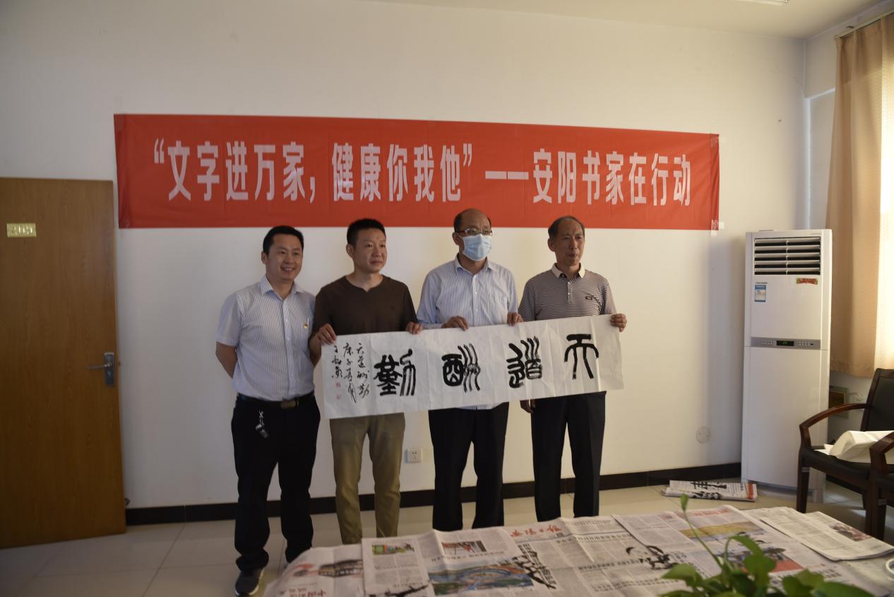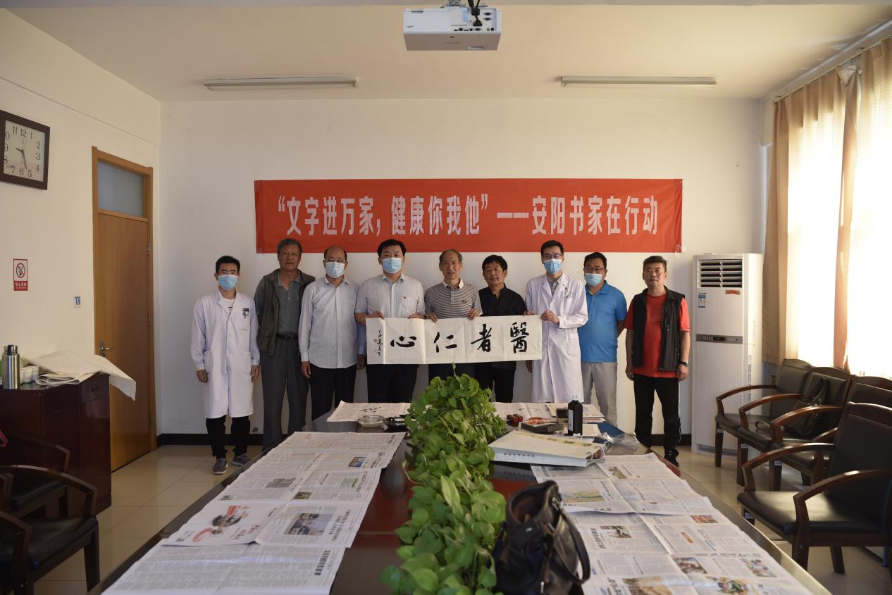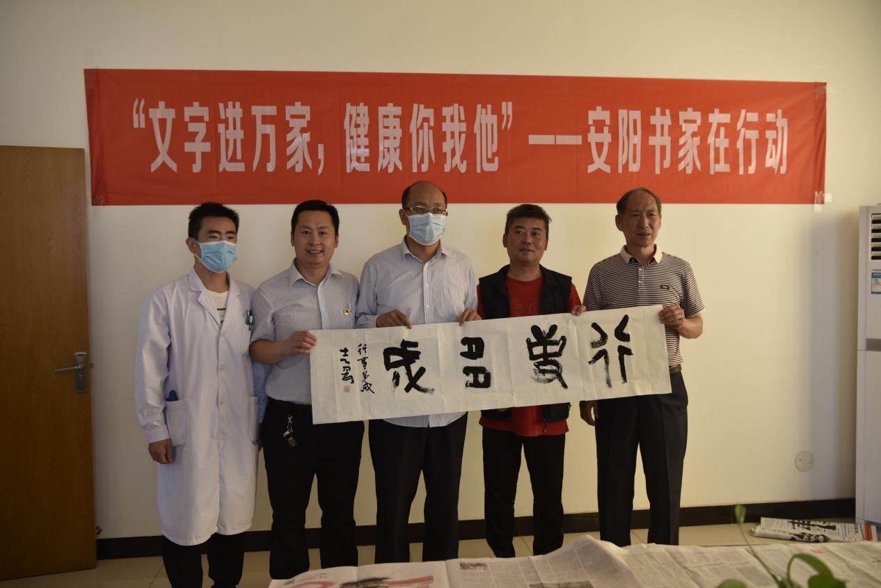 2020年5月26日,安陽(yáng)市書(shū)法家協(xié)會(huì )主席李建學(xué)帶領(lǐng)中國書(shū)法家協(xié)會(huì )會(huì )員、安陽(yáng)市書(shū)協(xié)副主席劉寶平,中國書(shū)法家協(xié)會(huì )會(huì )員、安陽(yáng)市書(shū)協(xié)副秘書(shū)長(cháng)王宏方,中國書(shū)法家協(xié)會(huì )會(huì )員殷志剛、王獻東,安陽(yáng)市書(shū)法家協(xié)會(huì )宣傳聯(lián)絡(luò )委員會(huì )秘書(shū)長(cháng)李廣慶等一行6人來(lái)到我院開(kāi)展了“文字進(jìn)萬(wàn)家,健康你我他”活動(dòng)。