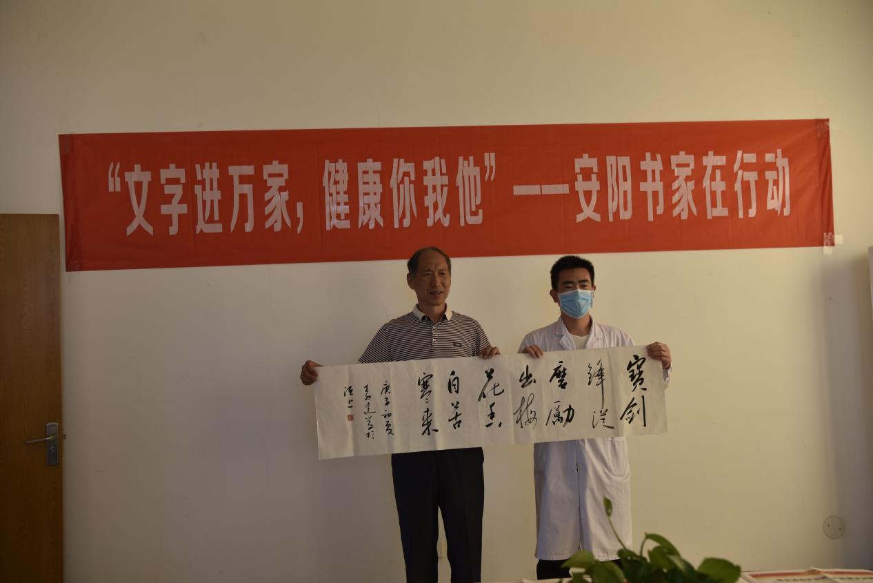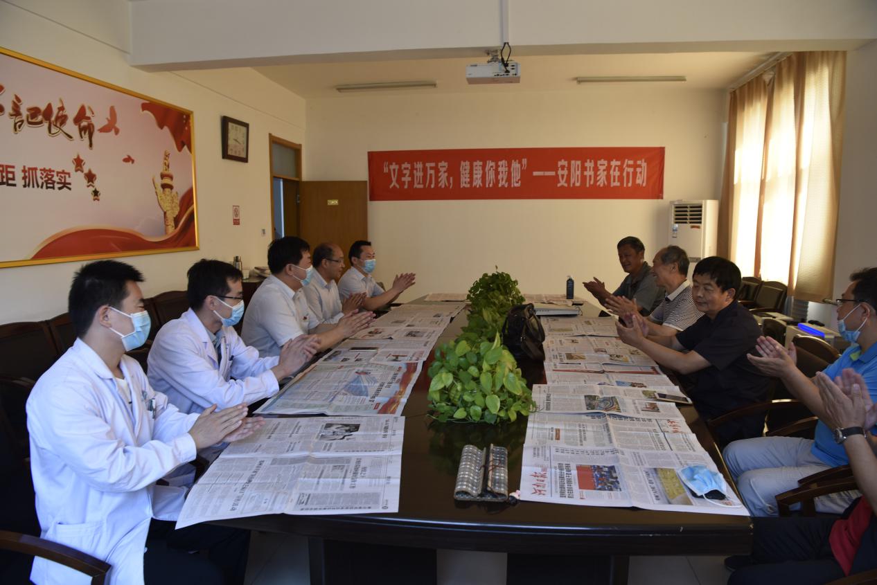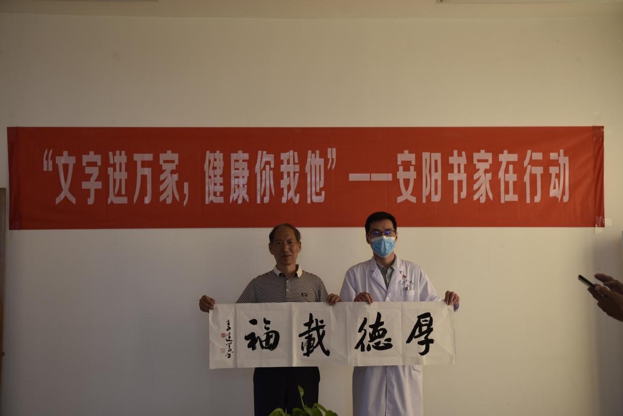 2020年5月26日,安陽(yáng)市書(shū)法家協(xié)會(huì )主席李建學(xué)帶領(lǐng)中國書(shū)法家協(xié)會(huì )會(huì )員、安陽(yáng)市書(shū)協(xié)副主席劉寶平,中國書(shū)法家協(xié)會(huì )會(huì )員、安陽(yáng)市書(shū)協(xié)副秘書(shū)長(cháng)王宏方,中國書(shū)法家協(xié)會(huì )會(huì )員殷志剛、王獻東,安陽(yáng)市書(shū)法家協(xié)會(huì )宣傳聯(lián)絡(luò )委員會(huì )秘書(shū)長(cháng)李廣慶等一行6人來(lái)到我院開(kāi)展了“文字進(jìn)萬(wàn)家,健康你我他”活動(dòng)。