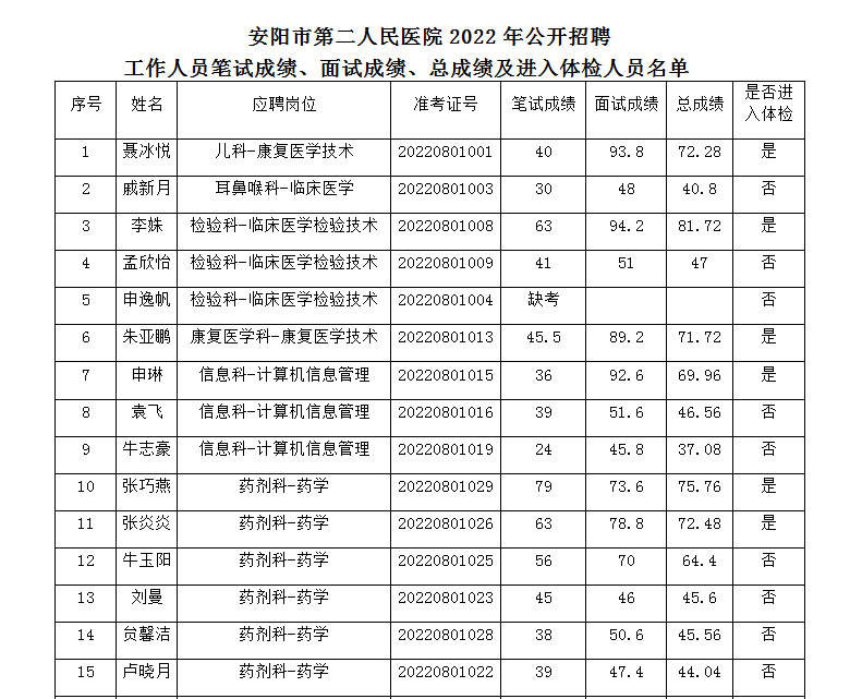 安陽(yáng)市第二人民醫院2022年公開(kāi)招聘工作人員筆試成績(jì)、面試成績(jì)、總成績(jì)及進(jìn)入體檢人員公告