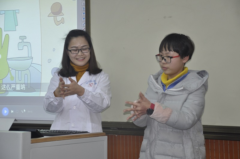 接下來(lái),醫院感染管理科方惠用淺顯的語(yǔ)言及動(dòng)畫(huà)視頻,告訴了學(xué)生們?yōu)槭裁匆词?,什么時(shí)候洗手及如何正確洗手等知識。